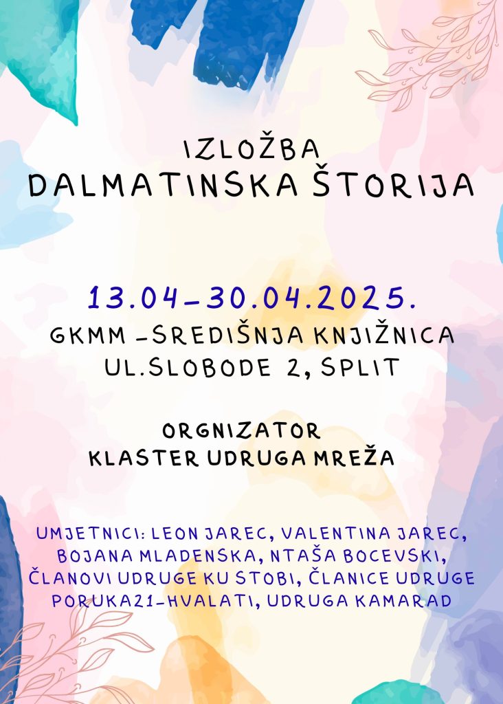 Ova posebna izložba donosi spoj umjetnosti, zajedništva i priča koje slave dalmatinski duh, tradiciju i kreativno izražavanje. Posjetitelji će imati priliku upoznati radove djece i članova udruga i talentiranih umjetnika i sudionika, koji kroz svoje stvaralaštvo prenose emocije, identitet i ljepotu svakodnevice.