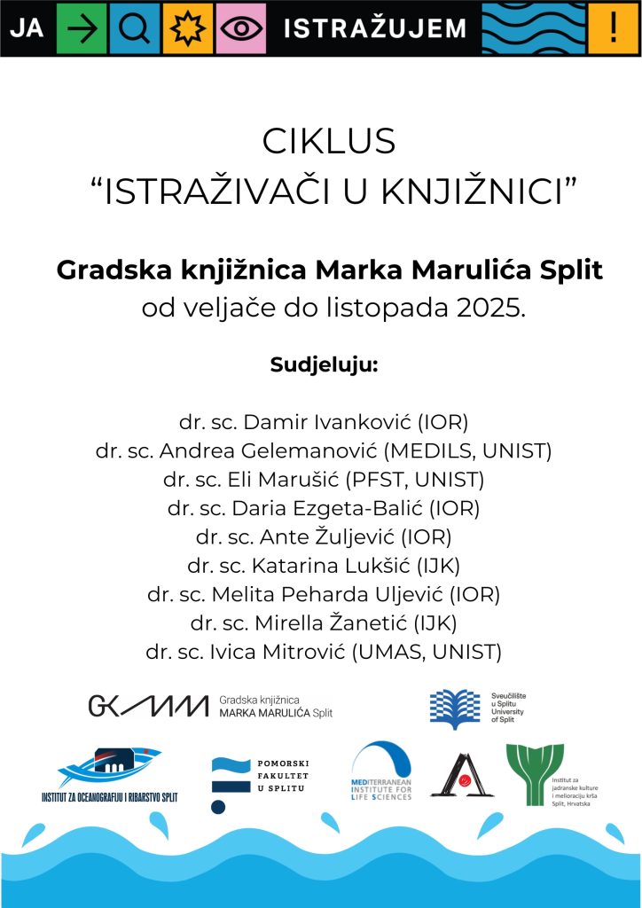 Ciklus započinje predavanjem dr. sc. Damira Ivankovića sa Instituta za oceanografiju i ribarstvo Split, na temu „Kako do podataka o moru? Nacionalna i europska infrastruktura za objavu i dijeljenje oceanografskih podataka“. Predavanje će se održati u srijedu, 26. veljače 2025. s početkom u 18.30 sati u Središnjici Gradske knjižnice Marka Marulića Split, na adresi Ulice slobode 2, a namijenjeno je općoj populaciji, studentima prirodnih znanosti kao i zaljubljenicima u more. Dr. sc. Ivanković predstavit će zakonske okvire i EU direktive te pokazati koji su podaci javno dostupni i gdje. Želite li saznati gdje pratiti kakvoću vode za kupanje, gdje saznati informacije o stanju morskog okoliša, marikulture i ribarstva, upoznati se s EMODnet-om (European Marine Observation and Data Network) i Europskom agencijom za zaštitu okoliša, saznati zašto je važna Barcelonska konvencija i čemu služi INFO/RAC (Information and Comunication Regional Activity Centre) nemojte propustiti ovo predavanje.