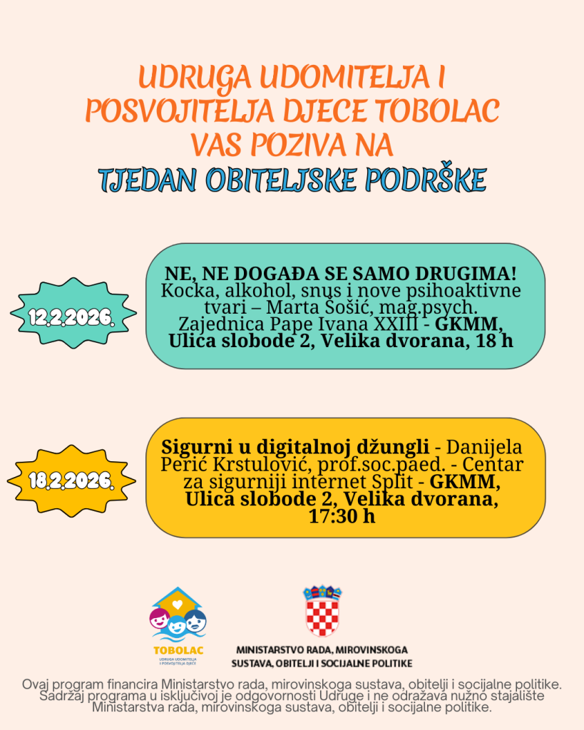 Predavanje će održati Danijela Perić Krstulović, prof.soc.paed. i psihoterapeut u Centar za sigurniji internet Split. Organizator je Udruga udomitelja i posvojitelja djece Tobolac. Program financira Ministarstvo rada, mirovinskoga sustava, obitelji i socijalne politike.