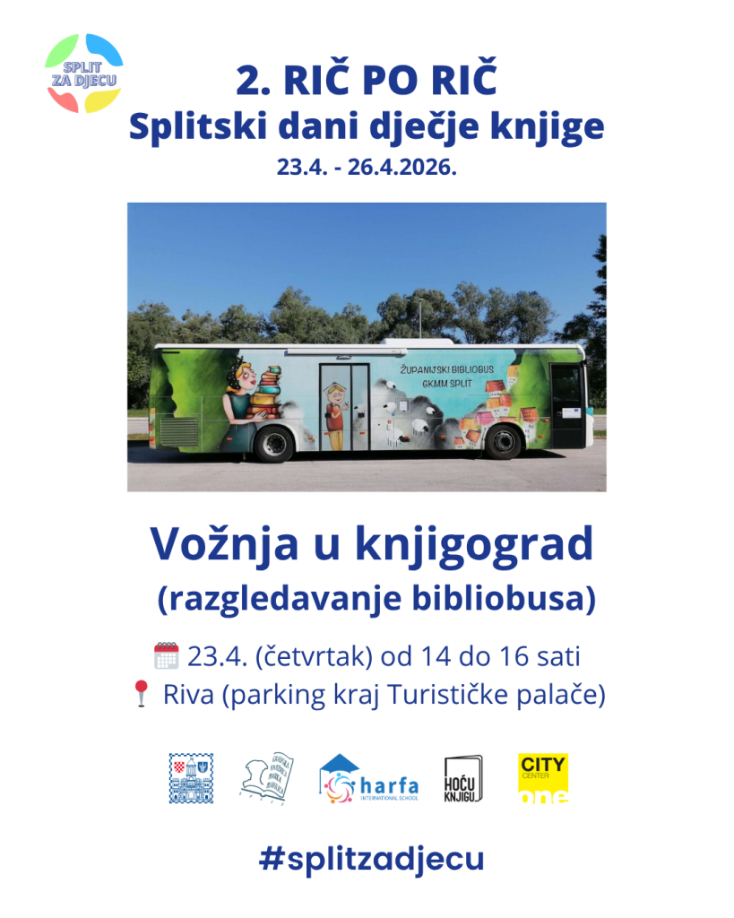 Povodom obilježavanja Svjetskog dana knjige, a u sklopu drugog izdanja manifestacije „Rič po rič: Splitski dani dječje knjige”, za učenike splitskih osnovnih škola organizira se edukativno razgledavanje županijskog bibliobusa.
